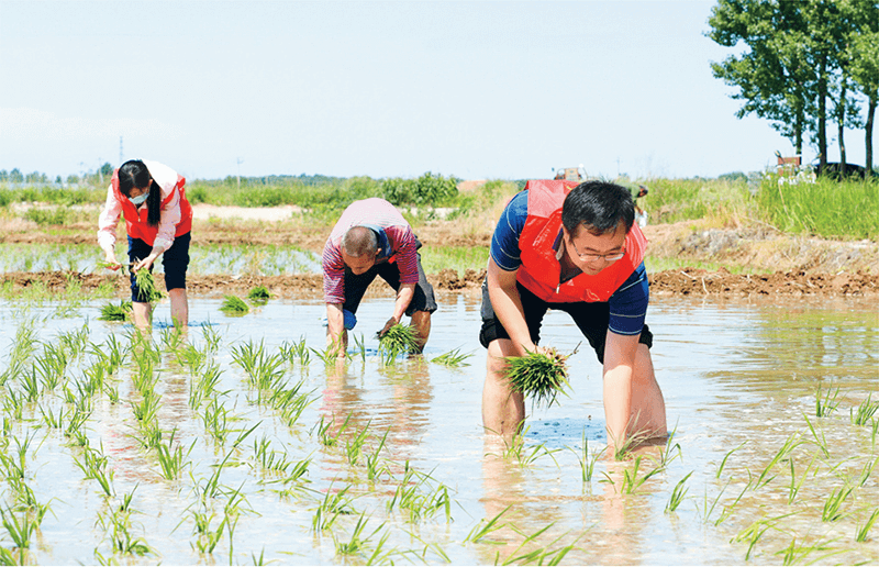 山東省煙臺市海陽市把黨史學習教育與群眾所需所盼相結合,將“我為群眾辦實事”實踐活動落實到田間地頭。圖為2021年6月21日,龍山街道的黨員、干部在西沽頭村稻田里幫農戶插秧?!∩綎|省委組織部供圖 李乃杰、徐藝/攝