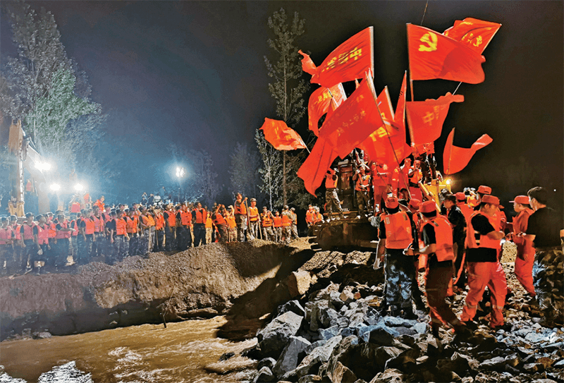 防汛救災中,基層黨組織和廣大黨員在風雨中逆行、在堤壩上奮戰(zhàn)、在黑夜里堅守,用實際行動踐行著初心使命,讓黨旗在防汛救災一線高高飄揚。圖為2021年7月26日2時27分,衛(wèi)河河南省鶴壁市??h新鎮(zhèn)鎮(zhèn)彭村段決口封堵成功場景。 河南省委組織部供圖 陳晨、張心致/攝