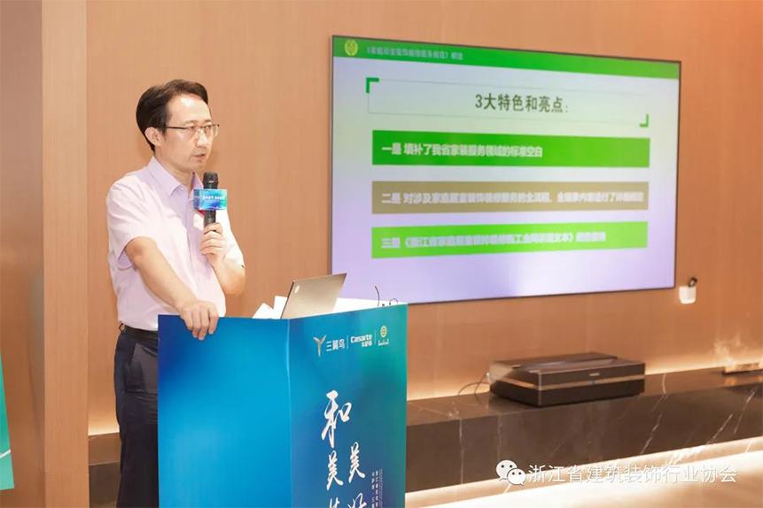 崔礪金秘書(shū)長(zhǎng)指出,省內(nèi)首部《家庭居室裝飾裝修服務(wù)規(guī)范》的團(tuán)體標(biāo)準(zhǔn)出臺(tái)很及時(shí)、也很必要,具有3大特色和亮點(diǎn):一是首次以標(biāo)準(zhǔn)的形式對(duì)家裝企業(yè)如何做好家庭居室裝飾裝修服務(wù)進(jìn)行了規(guī)范,填補(bǔ)了我省家裝服務(wù)領(lǐng)域的標(biāo)準(zhǔn)空白;二是標(biāo)準(zhǔn)從消費(fèi)者角度出發(fā),針對(duì)家裝服務(wù)過(guò)程中消費(fèi)者碰到的痛點(diǎn)、難點(diǎn)問(wèn)題,對(duì)涉及家庭居室裝飾裝修服務(wù)的全流程、全鏈條內(nèi)容進(jìn)行了詳細(xì)規(guī)定,有利于規(guī)范市場(chǎng),推進(jìn)我省建筑裝飾裝修行業(yè)的可持續(xù)、高質(zhì)量發(fā)展;三是標(biāo)準(zhǔn)發(fā)布后,與省市場(chǎng)監(jiān)督管理局、省消費(fèi)者權(quán)益保護(hù)委員會(huì)、省建筑裝飾行業(yè)協(xié)會(huì)共同發(fā)布的《浙江省家庭居室裝飾裝修施工合同示范文本》配套使用,對(duì)保護(hù)消費(fèi)者權(quán)益,構(gòu)筑透明、安全、健康的市場(chǎng)消費(fèi)環(huán)境,具有重要意義。